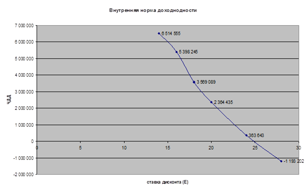 По данным таблицы 11 можно наглядно, без дополнительных расчетов, определить период окупаемости. Дисконтированный период окупаемости – это, по сути, тот шаг расчета, на котором накопление чистого дисконтированного денежного потока приобретает положительное значение. В строке 6 таблицы 11 помещены дисконтированные значения денежных потоков предприятия вследствие реализации инвестиционного проекта. Рассмотрим следующую интерпретацию дисконтирования: приведение денежной суммы к настоящему моменту времени. Таким образом, оставшаяся часть денежного потока призвана покрыть исходный объем инвестиций. С течением времени величина непокрытой части уменьшается. Так к концу пятого года непокрытыми остаются 3 146 066 рублей и поскольку дисконтированное значение денежного потока в седьмом году составляет 3 200 982 рублей, становится ясным, что период покрытия инвестиций составляет пять полных лет и какую-то часть года. Более конкретно получим: 5 + 3 146 066/3 200 983 = 5,98. Видим, что с первого года проекта чистый денежный поток накопительным итогом имеет отрицательное значение, а на шестой год становится положительным. Таким образом, период окупаемости равен 5,98 года. Итоговое значение чистого дисконтированного денежного потока – это показатель NPV, или то количество денег, которое планируется получить по достижении горизонта планирования с учетом временного фактора. В данном проекте ЧДД равен 6 514 555 рубля. Положительное значение показывает, что вызываемый инвестициями денежный поток в течение всей экономической жизни проекта превысит первоначальные капитальные вложения, обеспечит необходимый уровень доходности на вложенные фонды и увеличение рыночной стоимости. Метод чистой текущей стоимости включает расчет дисконтированной величины положительных и отрицательных потоков денежных средств от проекта. Данный проект имеет положительную чистую текущую стоимость, так как дисконтированная стоимость его входящих потоков превосходит дисконтированную стоимость исходящих. Сальдо инвестиционного проекта по каждому году имеет положительное значение, следовательно, предприятие на каждом этапе развития проекта остается платежеспособным. Для нахождении внутренней нормы доходности используют те же методы, что и для чистой текущей стоимости, но вместо дисконтирования потов наличности при заданной минимальной норме процента определяют такую ее величину, при которой чистая текущая стоимость равна нулю (значения приведены в таблице 12). Таблица 12 Значения чистой дисконтированной стоимости при различных ставках дисконта