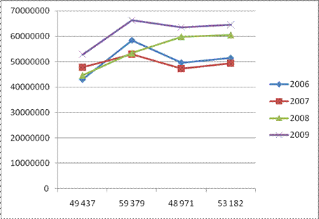 Рисунок 2. Объем реализации по кварталам 2006-2009 гг. Приложение 3. Динамика товарооборота организации «Адидас-Войковская» За 2006 - 2008 гг. (Таблица№1) Результаты деятельности магазина «Адидас-Войковская» в 2010 году. (Таблица №2) Таблица1