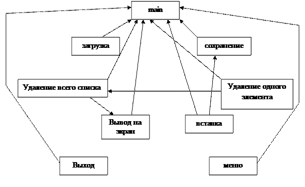 Выполнил студент группы ВТК-281 Киселёв С.А. . _______________ (подпись, дата) Проверил: Бычков М.И. Куйбышев 2010 Задание: Разработать программу реализующая следующие элементы списка: Вставка, удаление, вывод на экран, чтение из файла, удаление последнего элемента и удаление всех элементов списка, осуществляет выход из программы. Структурное и функциональное описание программы: //-------------------------------Подключение библиотек-------------------------- #include <iostream> // Стандартные потоки ввода-вывода: // ios,istream,ostream,iostream #include <conio> #include <windows> #include <stdio> #include <stdlib> #include <fstream> // Файловые потоки ввода-вывода: //------------------------Русификатор------------------------------------------------ void rus(char *str) { char buf[100]; CharToOem(str,buf); cout<<buf; return; } //------------------------Вывод на экран меню и запись значения-------------- int menu() {int n; rus(" Меню ");cout<<"\n"; rus(" ");cout<<"\n"; rus(" 1 - Вставка ");cout<<"\n"; rus(" 2 - Удаление ");cout<<"\n"; rus(" 3 - Вывод на экран ");cout<<"\n"; rus(" 4 - Сохранение ");cout<<"\n"; rus(" 5 - Чтение");cout<<"\n"; rus(" 6 - Удаление всего списка");cout<<"\n"; rus(" 0 - Выход ");cout<<"\n"; rus("==============================");cout<<"\n"; rus(" Введите пункт меню ");cout<<"\n"; cin>>n; return n;} // ввод с клавиатуры //----------------------------------------------------------------------------------- struct node{char x[15]; node *next;}; node *un=NULL; //создаём указатели на начало списка node *uk=un; //создаём указатель на конец списка node *r,*pre; //ещё 2 указателя int count; //--------------------------------Удаление всего списка------------------------- void dellist(node *p) // функция удаления { while(p){delete p; p=p->next; } uk=un; } //----------------------------------Удаление------------------------------------ void delet(node*p) { node *h=p; if(p==uk) { uk=p->next;delete h; } else { node *f=p->next; p->next=(p->next)->next; delete f; } } //-----------------------------------Сохранение--------------------------------- void save(node *p) { ofstream out("a.txt"); while(p) { out<<p->x<<"\n"; p=p->next; } rus("СОХРАНЕНО!!!"); cout<<"\n"; } //-------------------------Print------------------------------------------------ void show(node *z){while(z){cout<<z->x<<"_____"<<z<<"\n";z=z->next;}} //--------------------------Запись в структуру------------------------ node* insert(node *p) { node *q=new node; rus("Введите значение \n"); textcolor(RED); rus ("!!!не более 15 символов!!!\n\n"); gotoxy(1.5,wherey()); cin>>q->x; q->next=p; return q; } //--------------------------Запись в структуру---------------------------------- node* insert(node *p, char* str) { node *q=new node; strcpy(q->x, str); //функция копирования q->next=p; return q; // функция возвращения переменной } int GetCountEl(node *p) { int n = 0; while(p) //цикл с предусловием { n++; p=p->next; } return n; } char* getEl(const int &num) { if(num < count) // структура (вид – ветвление) { node *p = uk; for(int i=0; i<num; i++) p = p->next; return p->x; } else return 0; // иначе возвращается 0 } void exchange(const int &dpos, const int &spos) { if((dpos<count)&&(spos<count)) { int i; char* temp; temp = new char[15]; node *dest = uk; node *source = uk; for(i=0;i<dpos;i++) dest = dest->next; for(i=0;i<spos;i++) source = source->next; strcpy(temp, source->x); strcpy(source->x, dest->x); strcpy(dest->x, temp); } } //--------------Загрузка-------------------------- loading() { char *str; str = new char[15]; ifstream inf("a.txt"); if (!inf) { rus("Ошибка при открытии файла!\n\n\n"); } else { while (!inf.eof()) { inf.getline(str,15); //введенная из файла строка if (strcmp("",str)) uk = insert(uk, str); } rus("Данные успешно загружены!\n\n\n"); } } //-------------------------Главная функция----------------------------------- int main() { int n=1; while(n){char x[15]; n=menu(); switch(n) // оператор выбора { case 1:clrscr(); cin>>x; uk=insert(uk,x);break; case 2:clrscr();delet(uk);break; case 3:clrscr();show(uk);break; case 4:clrscr();save(uk);break; case 5:clrscr();loading();break; case 6:clrscr();dellist(uk);break; case 0:clrscr();exit(0); } } getch(); } Схема
