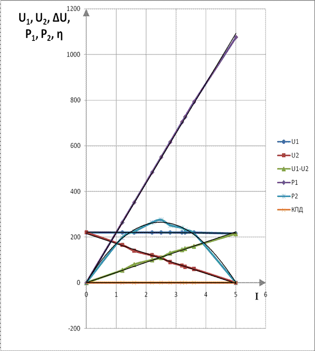 Вывод В процессе лабораторной работы изучили энергетический процесс и распределение напряжений в схеме замещения 2-х проводной линии электропередачи при постоянной величине напряжения в начале линии в зависимости от тока в линии, определяемого количеством включенных потребителей электрической энергии и выявили следующие зависимости. |
