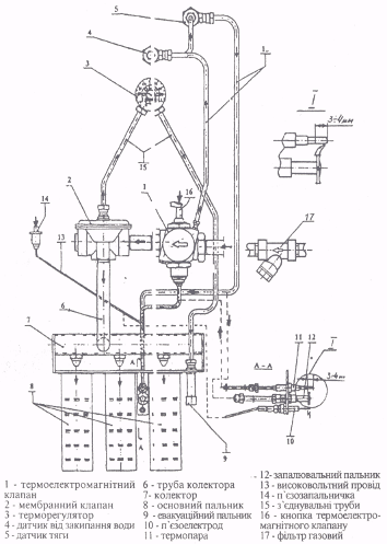 Будова та принцип роботи. Подивіться на Рис. 1. Корпусні деталі виготовлені з алюмінієвого сплаву. Автоматика складається з блоків безпеки і регулювання. Блок безпеки складається з термоелектричного клапана та термопари, датчиків тяги та закипання води, з’єднаних між собою імпульсними трубками. Блок регулювання – манометричний. Мембранний клапан приводиться до дії манометричним сильфонним перетворювачем (терморегулятор поз. 3 ¯). Автоматика виконує такі функції: 1 – забезпечує подачу газу на запальник і основний пальник за допомогою ручного керування; 2 – автоматично вимикає подачу газу в апарат при погашені полум’я запальника, порушення тяги в димоході, нагріву води вище граничного діапазону регулювання; 3 – підтримує температуру в опалювальному приміщенні в заданих межах шляхом автоматичного вмикання і вимикання подачі газу на основний пальник в залежності від температури води в системі опалення; 4 – забезпечує ручне вмикання подачі газу на основний пальник при працюючому запальнику; 5 – забезпечує перекриття газу на основний пальник в режимі «Пуск».