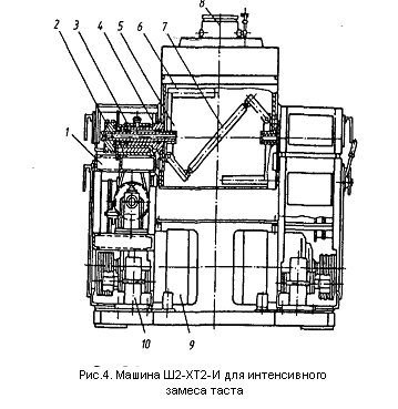 Тестомесильная машина Ш2-ХТ2-И для интенсивного замеса пшеничного и ржано-пшеничного теста (рисунок 4) может использоваться в агрегатах для приготовления теста ускоренным способом, а также работать автономно. Машина состоит из стационарной месильной емкости 5 с полуцилиндрическим днищем, изготовленной из нержавеющей стали. Внутри емкости расположен месильный орган из двух крестовин 6, соединенных между собой штангой 7. Каждая из крестовин укреплена на отдельном шлицевом валу 2, который расположен в опорах З и поворотных цапфах 4. Каждая крестовина месильного органа имеет самостоятельный при вод и вращается от трехскоростного электродвигателя 9 через клиноременную передачу, цилиндрический редуктор 10 и зубчатую цепную передачу. Натяжение цепи осуществляется с помощью натяжного устройства. Благодаря принятой конфигурации месильного органа, тесто в процессе замеса перемещается по сложной траектории, в результате чего обеспечивается его интенсивная механическая обработка. Над месильной емкостью 5 на кронштейне закреплена неподвижная крышка. Для обеспечения герметизации крышка и месильная емкость имеют совместное лабиринтное уплотнение. В крышке расположены патрубок 8с шибером для загрузки муки и два штуцера с кранами для подачи в емкость жидких компонентов. Подача муки и жидких компонентов в емкость прекращается поворотом шибера и кранов через систему рычагов. Выгрузка теста по окончании замеса осуществляется путем поворота месильной емкости вокруг горизонтальной оси на угол 120°. В процессе замеса теста емкость закрепляется в горизонтальном положении фиксатором при помощи рукоятки. Все элементы машины смонтированы на станине 1, состоящей из двух стоек и основания. Управление работой машины осуществляется от отдельно стоящего блока управления, смонтированного в правой стойке станины. Замес теста в машине осуществляется в трех режимах движения месильного органа по заранее заданной программе в зависимости от хлебопекарных свойств муки. Частота вращения месильного органа соответственно равна 60, 90, 120 мин Продолжительность работы на каждой скорости обусловливается свойствами сырья. Суммарное время замеса на трех скоростях варьирует от 2,5 до З мин. При необходимости замес может осуществляться в автоматическом режиме на двух скоростях. Необходимое время обработки на соответствующей скорости устанавливается при помощи реле, расположенного на панели пульта управления.7.3. Тестомесильные машины непрерывного действия. Тестомесильные машины непрерывного действия входят в состав тестоприготовительных агрегатов и имеют стационарную емкость в виде одной или двух рабочих камер с месильными органами разнообразной формы, вращающимися на горизонтальном валу. 1.7. Тестомесильная машина Х-26А