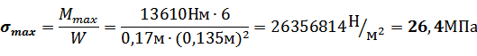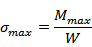 где W – момент сопротивления, равный для прямоугольного сечения Полученное значение σmax сравнивают с пределом текучести σ0,2 материала бандажа. Внутренний радиус бандажа R=1100мм; ширина бандажа b=170мм; высота поперечного сечения бандажа H=135мм; нагрузка, действующая на бандаж