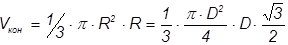 Для нахождения объема конуса необходимо Знать его высоту, которую определим из прямоугольного треугольника (на рисунке не показан):