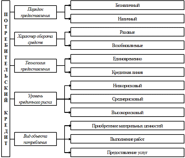 Рисунок 1.2- Классификация потребительского кредита по порядку и технологии предоставления, характеру оборота средств, уровню кредитного риска, виду объекта потребления