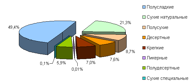 Рисунок 1.1.1. - Структура российского винного рынка в 2008 году, % в натуральном выражении (по материалам исследований компании «Бизнес Аналитика») Таким образом, общая доля импорта вин из стран СНГ – это порядка 45% отечественного рынка в натуральном выражении. Оставшиеся 9-10% приходятся на вина из стран дальнего зарубежья, в основном это продукция, производимая в европейских странах: Болгарии, Германии, Испании, Франции, а также в странах Южной Америки: Чили и Аргентине. Об ущербе, нанесенном запретом молдавским виноделам, свидетельствует тот факт, что в Россию поставлялось около 70% винной продукции, производимой в этих странах. В 2009 году (за 9 месяцев) экспорт вина в Россию из Молдавии составил 318 млн. долларов США. Россия является крупнейшим импортером молдавских вин, их доля составляет 60% от общего объема импорта в нашу страну. В настоящее время производители вин из Молдавии энергично ищут новые рынки сбыта, переориентируя часть экспортных потоков с России на Украину, Польшу, Румынию. Также виноделы готовят иск руководителю Роспотребнадзора. В отношении введенного запрета в настоящее время остается ряд неясных моментов. В частности, вице-президент некоммерческой организации «Союз участников алкогольного рынка» (СУАР) Петр Парыгин задается вопросами: какие вина вошли в «черный список»? Какие компании их произвели? По каким признакам и показателям их заблокировали и по каким методикам проводили проверку качества? [51] Среди различных видов виноградных вин в структуре импорта преимущественную долю составляют полусладкие вина - 49,4%, за ними следуют сухие натуральные вина – 21,3% (см. рисунок 1.1.2). Показатели таможенной статистики раскрывают основные тенденции потребительских предпочтений россиян. Примечательно, что, тогда как в России наиболее популярны полусладкие вина, в странах Евросоюза большинство потребителей отдает предпочтение сухим винам. Прослеживается эта тенденция и в структуре импорта – около 30% поставляемых в Россию сухих вин приходится на европейские страны. Характеризуя потребительские предпочтения, необходимо отметить, что по параметру цвета большинство российских потребителей отдает предпочтение красным винам - 50% продаж по объему (согласно результатам исследований компании «Бизнес Аналитика»). Белые вина несколько менее популярны, составляя 44% продаж в натуральном выражении. Розовые вина в России не пользуются спросом, их доля в продажах составляет лишь 5%. Вина других цветов составляют менее 1% продаж. Весьма значимым фактором, оказывающим влияние на выбор вина, для большинства российских потребителей выступает цена.