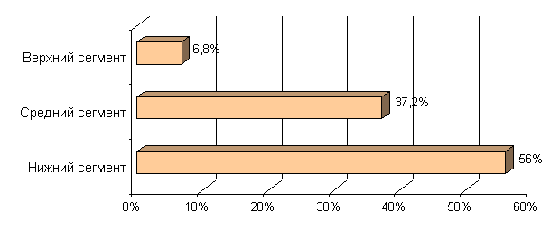 Рисунок 1.1.2 - Структура импорта виноградных вин по видам в 2008 году, % в натуральном выражении (по данным ФТС РФ) [51] На розничном рынке виноградных вин выделяются три основных ценовых сегмента (по материалам исследований фирмы «ИнфоТехКонсалт-Р»): - нижний ценовой сегмент, к которому относятся вина стоимостью до 100 рублей за стандартную бутылку емкостью 0,75 литра; - средний ценовой сегмент, включает вина стоимостью 100 – 300 рублей; - верхний ценовой сегмент – это вина стоимость свыше 300 рублей за бутылку 0,75 литра. Эксперты компании «Бизнес Аналитика» помимо верхнего ценового сегмента предлагают выделять также сегмент премиум. По их оценкам, границы среднего ценового сегмента составляют 80-160 рублей за бутылку 0,75 литра. Границы верхнего сегмента – 160-300 рублей. Премиум сегмент включает вина стоимостью более 300 рублей. Согласно результатам исследований компании «Бизнес Аналитика», более 50% продаж винной продукции на российском рынке (в натуральном выражении) составляет вино нижнего ценового сегмента (см. рисунок 1.1.3). Массовый спрос предъявляется и на вина среднего ценового сегмента – 37,2% по объему. Этот сегмент, по оценкам экспертов, в настоящее время наиболее привлекателен для производителей, поскольку является наиболее емким и характеризуется наиболее высокими темпами роста. Объем продаж вин высокой и премиальной ценовых категорий незначителен (5,8 и 1% соответственно), эксперты полагают, что для продукции этих ценовых сегментов время на российском рынке еще не пришло. По прогнозам экспертов компании «Бизнес Аналитика», одними из основных тенденций потребительского рынка виноградных вин в России в ближайшем будущем будут увеличение общего потребления, а также изменение структуры спроса. Показатель уровня потребления вина на душу населения в России в настоящее время остается довольно низким – 4,3 литра на человека в год, тогда как, к примеру, во Франции он оценивается в 55 литров в год, а в близкой к России по климатическим условиям Финляндии – около 20 литров в году на человека. В отношении динамики потребительских предпочтений уже сегодня заметен устойчивый рост доли продаж импортной продукции, а также увеличение предпочтений винам в упаковках bag-in-box, Tetra Pak.