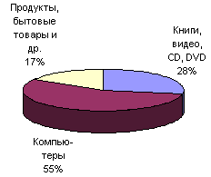 Основная доля выполненных заказов приходится на книги, аудио, видео, CD, DVD. Но они составляют всего 28% оборота. Зато всего 8% сделок по компьютерам составляют больше 50% процентов всего оборота розничной интернет-торговли.