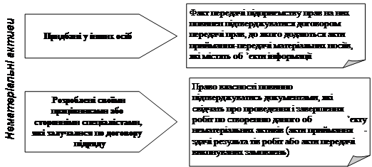 3. Облік придбання (створення) нематеріального активу. Придбаний або одержаний нематеріальний актив (як і кожний інший актив) відображають у балансі, якщо існує вірогідність одержання майбутніх економічних вигод від його використання і вартість цього активу може бути достовірно визначена. Нематеріальні активи надходять на підприємство в результаті: 1. Придбання: - за грошові кошти; - за бартером. 2. Одержання як внеску засновника до статутного фонду підприємства. 3. Самостійного виготовлення об’єкта нематеріальних активів. 4. Безоплатного одержання об’єкта нематеріальних активів. Нематеріальний актив, одержаний у результаті розробки , відображають у балансі за умов, що підприємство має: - намір, технічну спроможність і ресурси для доведення нематеріального активу до стану придатності для реалізації або використання; - можливість одержання майбутніх економічних вигод від його реалізації або використання; - можливість одержання майбутніх економічних вигод від його реалізації або використання; - інформацію для достовірного визначення витрат, пов’язаних із його розробкою. Якщо нематеріальний актив не відповідає зазначеним критеріям визнання, витрати, пов’язані з його придбанням або створенням, визнаються витратами того звітного періоду, протягом якого вони здійснювалися, без визнання таких витрат у майбутнього нематеріальним активом. Не визнаються активом і відображаються у витратах того звітного періоду, протягом якого вони здійснювалися, без визнання таких витрат у майбутньому нематеріальним активом. Не визнаються активом і відображаються у витратах того звітного періоду, протягом якого вони здійснювалися: - витрати на дослідження: - витрати на підготовку та перепідготовку кадрів; - витрати на рекламу та просування продукції на ринку; - витрати на створення, реорганізацію та переміщення підприємства або його частини; - витрати на підвищення ділової репутації підприємства (гудвіл), вартість видань. Придбані (створені) нематеріальні активи зараховуються на баланс підприємства за первісною вартістю. Первісна вартість придбаного нематеріального активу складається з ціни (вартості) придбання (крім одержаних торгових знижок), мита, непрямих податків, що не підлягають компенсації, та інших витрат, які безпосередньо пов’язані з його придбанням і доведенням до стану придатності для використання за призначенням. Витрати на сплату відсотків за кредит не включаються до первісної вартості нематеріальних активів, які придбано (створено) цілком або частково за рахунок банківського кредиту. Первісна вартість нематеріального активу, придбаного в результаті обміну на подібний об’єкт, дорівнює залишковій вартості переданого нематеріального активу. Якщо залишкова вартість переданого об’єкта перевищує його справедливу вартість, первісною вартістю нематеріального активу, одержаного в обмін на подібний об’єкт, є його справедлива вартість, а різницю включають до фінансових результатів (витрат) звітного періоду. Первісна вартість нематеріального активу, придбаного в обмін (або частковий обмін) на неподібний об’єкт, дорівнює справедливій вартості переданого нематеріального активу, збільшеній (зменшеній) на суму грошових коштів або їхніх еквівалентів, яку було передано (одержано) під час обміну. Первісною вартістю безоп