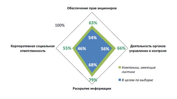 Рис.1. Тенденции развития практики корпоративного управления в 2004-2009 гг. В области обеспечения прав акционеров, где уровень развития практики российских компаний в течение 2004-2008 гг. колебался в узком диапазоне от 47 до 51%, в 2009 году наметилась позитивная динамика: здесь доля соблюдаемых в среднем рекомендаций в целом по выборке за последний год выросла на 3 п.п. (п.п. – процентный пункт) и составила 54%. В рамках компонента «Деятельность органов управления и контроля» сохранилась устойчивая динамка роста, наблюдавшаяся в течение 2004-2008 гг.: здесь доля соблюдаемых в среднем рекомендаций в целом по выборке в 2009 году достигла 56%, превысив значение предыдущего года на 3 п.п. В рамках компонента «Раскрытие информации» сохраняется наиболее высокий относительно других компонентов уровень развития практики корпоративного управления. По сравнению с 2004 годом доля соблюдаемых в среднем рекомендаций в целом по выборке выросла на 20 п.п. до 68% в 2009 году. Однако динамика изменений за последний год заметно снизилась: прирост показателя в 2009 году составил 1 п.п., в то время как в течение 2004-2008 гг. в среднем ежегодный прирост был на уровне 4,75 п.п. В компоненте «Корпоративная социальная ответственность» постепенный рост уровня данной составляющей практики корпоративного управления российских компаний, наблюдавшийся в течение 2004-2008 гг., прекратился. В 2009 году доля рекомендаций, соблюдаемых в среднем по выборке, осталась неизменной – 46%. Корпоративная социальная ответственность остается наименее развитым из всех рассматриваемых в рамках исследования компонентов практики корпоративного управления. В рамках каждого компонента практики корпоративного управления выделяются как аспекты, по которым наблюдалась положительная динамика их изменения, так и аспекты, находящиеся на невысоком уровне развития и требующие серьезного улучшения. Подробный анализ по всем аспектам практики корпоративного управления представлен в следующих разделах настоящего исследования. Анализ результатов исследования показывает, что основным стимулом, побуждающим российские компании улучшать практику своего корпоративного управления, постепенно внедряя и используя больше принципов, стандартов и процедур передовой практики в этой области, продолжает оставаться включение акций компании в биржевой листинг и необходимость соблюдения его правил в части корпоративного управления. Потому компании, имеющие листинг, демонстрируют более высокий, чем в целом по выборке, уровень развития практики корпоративного управления (рис. 2).