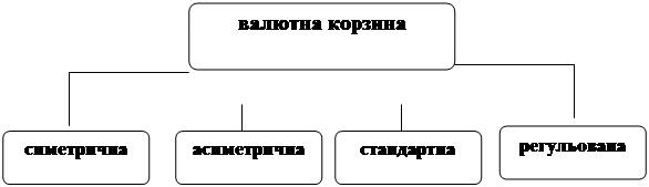 Рис. 2.1 Види валютних корзин · Симетрична корзина - валюти наділені однаковими питомими вагами. · Асиметрична корзина - валюти наділені різними питомими вагами. · Стандартна корзина - валюти зафіксовані на визначений період застосування валютної одиниці в якості валюти обмовки. · Регульована корзина - валюти змінюються в залежності від ринкових факторів [11]. Перевагою застосування СДР або ЕКЮ як бази багатовалютної обмовки полягає в тому, що регулярні і загальновизнані їхні котировки виключають невизначеність при підрахунку сум платежу. Складовими елементами механізму валютної обмовки є: - початок її дії, який залежить від встановленої в контракті границі коливань курсу; - дата базисної вартості валютної корзини. Датою базисної вартості звичайно є дата підписання контракту або попередня їй дата. Іноді застосовується змінна дата базисної вартості, яка створює додаткову невизначеність. - дата або період визначення умовної вартості валютної корзини на момент платежу: звичайно, робочий день безпосередньо перед днем платежу або декілька днів перед ним. - обмеження дії валютної обмовки при зміні курсу валюти платежу проти курсу валюти обмовки шляхом встановлення нижньої і верхньої границі дії обмовки (звичайно у відсотках до суми платежу) [ 9 ]. Іншими формами багатовалютної обмовки є: 1. Використання в якості валюти платежу декількох валют з узгодженого набору, наприклад: долар, марка, швейцарський франк і фунт стерлінгів. 2. 0пціон валюти платежу - на момент укладання контракту ціна фіксується в декількох валютах, а при наступі платежу експортер має право вибору валюти платежу. Обмеженість застосування валютної обмовки взагалі (і багатовалютної зокрема) полягає в тому, що вона страхує від валютного й інфляційного ризику лише в тому випадку, коли зріст товарних цін відбивається на динаміки курсів валют. Прикладом може служити Росія, де валютні обмовки зараз практикуються повсюдно, у тому числі і при внутрішніх розрахунках: незважаючи на те, що продавці товарів, як правило, обмовляють їхню ціну в залежності від курсу долара, їхні втрати від внутрішньої інфляції не компенсуються зростанням курсу. У світовій практика для страхування експортерів і кредиторів від інфляційного ризику використовуються товарно-цінові обмовки. Товарно-цінова обмовка - умова, яка включається в міжнародний контракт з метою страхування від інфляційного ризику [11]. До товарно-цінових обмовок відносяться: ¨ Обмовки про змінну ціну, яка підвищується в залежності від ціноутворюючих факторів. ¨ Індексна обмовка - умова, за якою суми платежу змінюються пропорційно зміні цін за періоди з дати підписання до моменту виконання зобов'язання. Індексні обмовки не одержали широкого поширення у світовій практика через труднощі з вибором і перерахунком індексів, які реально відбивають зростання цін. ¨ Комбінована валютно-товарна обмовка використовується для регулювання суми платежу з врахуванням зміни валютних курсів і товарних цін. У випадку односрямованої динаміки зміни валютних курсів і товарних цін підрахунок сум платежу відбувається пропорційно фактору, який максимально змінився. Якщо ж за період між підписанням і виконанням угоди динаміка валютних курсів і динаміка товарних цін не збігалися, то сума платежу змінюється на різницю між відхиленням цін і к