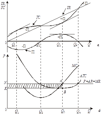 тобто МR – MC = 0, або МR = MC. (4) Отже, особливістю ринку досконалої конкуренції є те, що окреме підприємство для максимізації свого прибутку повинно виконувати умови подвійної рівності МR = MC = P. (5) За інших рівних умов підприємство для встановлення максимуму свого прибутку може використовувати два порівняльні методи: за першим порівнюються величини загального виторгу і загальних витрат, за другим - зіставляються граничні величини виторгу та витрат (рис.9).