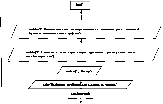Оглавление 1 Задание №1. 1.1 Блок-схема программы. 1.2 Работа программы 2 Задание №2. 2.1 Блок-схема программы 2.2 Работа программы. 3 Задание №3. 3.1 Блок-схема программы 3.2 Работа программы 4 Задание №4. 4.1 Работа программы 5 Задание №5. 5.1 Блок-схема программы 5.2 Работа программы 6 Заключение. 7 Список используемой литературы. 8 Приложения А 9 Приложение Б 10 Приложение В 11 Приложение Г 12 Приложение Д 1 Задание №1Подсчитать количество слов последовательности, начинающихся с большой буквы и оканчивающихся цифрой. Напечатать слова, содержащие задаваемую цепочку символов и хотя бы один знак. 1.1