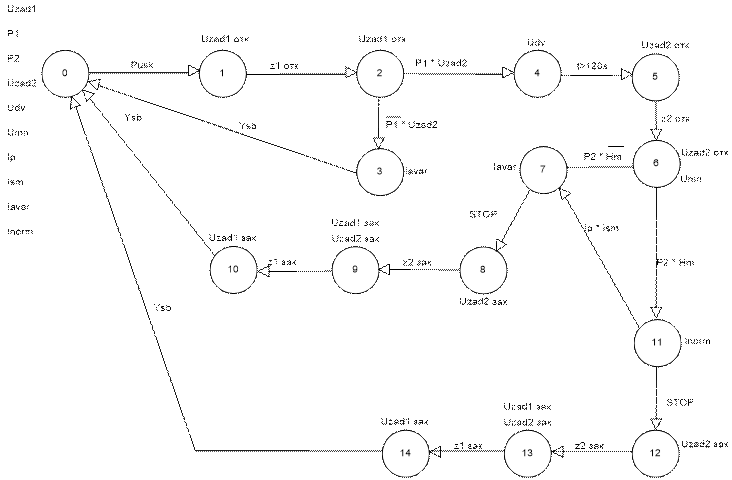 Постановка задачи порядка пуска и остановки ЦНС-180 При пуске открывается задвижка на входной магистрали. При наличии во входном трубопроводе давления 0,1 МПа и закрытой задвижки на напорном трубопроводе включить электродвигатель. Через две минуты открыть задвижку на напорном трубопроводе. Запустить маслонасос и при достижении в конце масляной магистрали давления 0,07 МПа проконтролировать уровень масла. После запуска насоса контролировать нагрев подшипников, поступление масла для их смазки. Остановка агрегата производится в следующей последовательности: - нажать кнопку стоп; - закрыть задвижку на напорном трубопроводе; - закрыть задвижку на входной магистрали; - отключить маслонасос.