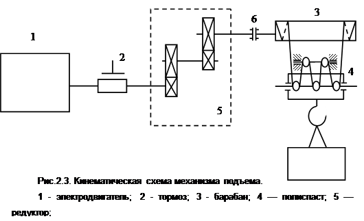 При расчете осветительной нагрузки по методу удельной мощности получили завышенное значение, поэтому в дальнейших расчетах будем использовать значение расчетной осветительной нагрузки, определенное по методу коэффициента использования. 2.4 Определение в выбор типа в числа электродвигателей для электропривода мостового крана 2.4.1 Электропривод механизма подъемной установки мостового крана Механизмы подъемной установки предназначены для подъема и опускания груза, оборудования и так далее при наматывании или сматывании каната на барабан лебедки. Кинематическая схема механизма подъема приведена на рис. 2.3.