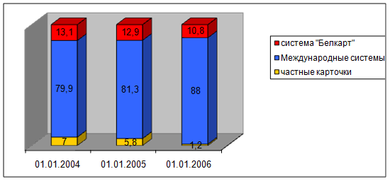 По итогам 2005 года наблюдается рост эмиссии карточек почти в 1,8 раза. Основное их количество – 98,43% эмитировано с открытием счетов в национальной валюте, и соответственно 1,57% приходится на карточки с открытыми счетами в иностранной валюте. 53% абсолютного прироста карточек обеспечил АСБ «Беларусбанк» (263786 карточек из 496787 карточек от общего количества). Существенно уменьшилась доля карточек системы «Белкарт», несмотря на увеличение количества карточек данной системы. Данное обстоятельство стало следствием опережающего роста эмиссии карточек Eurocard/Mastercard, что можно объяснить следующим. Эмиссия карточек в республике в основном осуществляется за счет реализации зарплатных проектов (обслуживание населения по заработной плате с использованием карточек систем «Eurocard/Mastercard» и «Белкарт»). И если в предыдущие годы банки не отдавали явного предпочтения какой-либо из систем (их доли в общем обьеме эмиссии были примерно равны), то в течение 2003 – 2004 годов преимущество отдавалось карточкам международной системы «Eurocard/Mastercard». Конкуренция на рынке рублевых продуктов показывает, что работать в структуре Еurорау и выпускать карточки Maestro сегодня гораздо выгоднее, чем заниматься пластиковыми платежными средствами «Белкарт». Последним без надежного маркетинга и экономического обоснования так и не суждено было выйти за рамки инженерного проекта. По оценкам специалистов руководящего состава «организационно-технологические принципы и тарифная политика «Белкарт» не совместимы со стандартами международных платежных систем. Внутриреспубликанская система создавалась и развивалась в изоляции от внешнего мира преимущественно за счет средств Национального банка. Система «БелКарт» обречена на вытеснение более совершенными и выгодными для банков аналогами международных платежных систем. Усилия Национального Банка, направленные на финансовую и нормативно-правовую поддержку «Белкарт», равно как и вмешательство в технологическую политику банков, приводят к дезорганизации рынка и отвлечению средств в неокупаемые, замкнутые сами на себе проекты» [13, с. 8-13].
