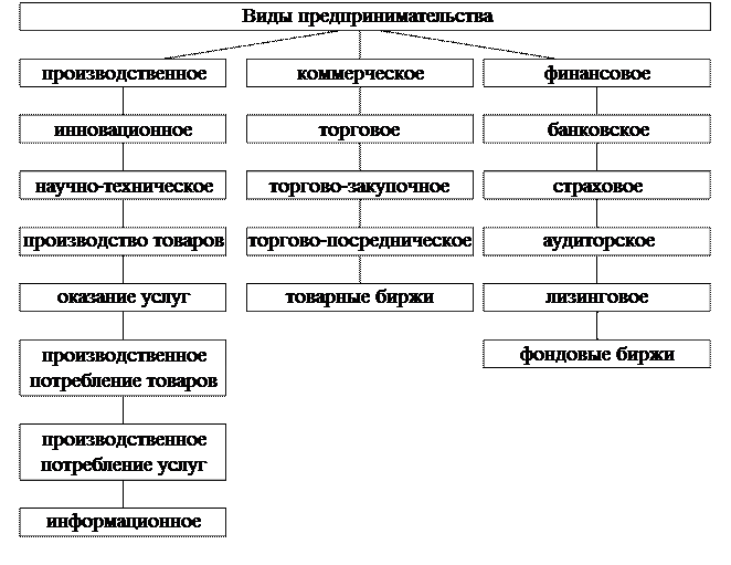 К основным организационно - экономическим формам предпринимательства можно отнести: концерны, ассоциаций, консорциумы, синдикаты, картели, финансово- промышленные группы. Концерн - это многоотраслевое АО, контролирующее предприятия через систему участия. Концерн приобретает контрольный пакет акций различных компаний, являющихся по отношению к нему дочерними. В свою очередь дочерние компании также могут владеть контрольными пакетами акций других акционерных компаний, нередко расположенных в других странах. Ассоциации - мягкая форма добровольного объединения экономически самостоятельных предприятий, организаций, которые одновременно могут входить в другие образования. В состав ассоциаций, как правило, входят односпециализированные предприятия и организации, расположенные на определённой территории. Основная цель создания ассоциаций – совместные решения научно- технических, производственных, экономических, социальных и иных задач. Консорциум представляет собой объединение предпринимателей с целью совместного проведения крупной финансовой операции (например, осуществление значительных инвестиций в крупный промышленный проект). Такое объединение предпринимателей имеет возможность вложить средства в крупный проект, при этом значительно уменьшается риск, возникающий при крупных вложениях, поскольку ответственность раскладывается на множество участников. В условиях научно- технической революции консорциумы возникают в новых отраслях и на стыке различных отраслей и предусматривают проведение совместных научных исследований. Синдикат - объединение сбыта продукции предпринимателями одной отрасли с целью устранения излишней конкуренции между ними. Картель - соглашение между предприятиями одной отрасли о ценах на продукцию, услуги, о разделе рынков сбыта, долях в общем объёме производства и др. Новой организационно- экономической формой предпринимательства служат финансово- промышленные группы (ФПГ). Они представляют собой объединение промышленного, банковского, страхового и торгового капиталов, а также интеллектуального потенциала предприятий и организаций. В зависимости от содержания предпринимательской деятельности и её связи с основными стадиями воспроизводственного процесса различают следующие основные виды предпринимательства: производственное, коммерческое, финансовое. Производственное предпринимательство можно назвать ведущим видом предпринимательства. Здесь осуществляется производство продукции, товаров, работ, оказываются услуги, создаются определенные духовные ценности. В условиях перехода к рыночной экономике эта сфера деятельности претерпела наибольшие негативные изменения: распались хозяйственные связи, нарушилось материально – техническое оснащение, упал сбыт продукции, резко ухудшилось финансовое положение предприятия. Вследствие этого широкому развитию производственного предпринимательства в ближайшие годы предстоит уделить наибольшее внимание. Состав производственного предпринимательства наглядно представлен в схеме на рис.2. Как видно по схеме, к производственному предпринимательству относятся инновационная, научно-техническая деятельность, непосредственно производство товаров и услуг, производственное их потребление, а также информационная деятельно