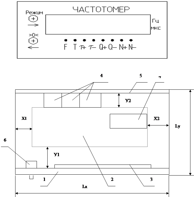 Рис. 2. 1 – Условная компоновочная схема частотомера с указанными краевыми полями. На рисунке показано: 1 - передняя панель, 2 – печатная плата, 3 – ЖКИ индикатор, 4 – соединители, 5 – задняя панель, 6 – кнопка, 7 - экран. 3. Разработка модуля с печатным монтажом3.1 Выбор материала и способ изготовления частотомера на однокристальном микроконтроллере АТ89С2051 Согласно чертежу ГЮИК758710 001 представлена печатная плата (ПП) частотомера. ПП двусторонняя размером 95х85(мм) толщиной 1,5(мм), изготовлена с точностью h14. Масса печатной платы 20г. Материал печатной платы стеклотекстолит марки СФ1-50Г-2 ГОСТ10316-78. Материал платы выбран из того, что он обеспечивает надежные механические, электроизоляционные и эксплуатационные параметры. Толщина платы выбрана из условий механических воздействий и в соответствии с группой жесткости. Плата изготовлена химическим методом (травление в хлорном железе FeCl3 ГОСТ4147-65). Дорожки наносим краской ТНПФ ТУ29-02-35-9-70. Плата изготовлена по ГОСТ23732-79, группа жесткости 1, класс точности 2. Отверстия под выводы и крепление элементов выполнены в узлах координатной сетки с шагом 2,5 (мм). В углах платы выполнены отверстия для крепления платы – диаметр 3(мм). Медные проводники выполнены по координатной сетке и ширина проводников 0,75±0,3 (мм). В узких местах допускается занижение проводников и контактных площадок до 0,15 (мм). Расстояние между проводниками не менее 0,3 (мм). Маркировка элементов выполнена белой краской ТУ029-02-859-78 с обеих сторон, шрифт 2, маркировка на чертеже указана условно. 3.2 Разработка модуля частотомера на однокристальном микроконтроллере АТ89С2051 Модуль представляет собой ПП прямоугольной формы с установленными элементами. Все элементы схемы электрической принципиальной ГЮИК.411140.001Э3 установлены на плате, кроме кнопок SB1, SB2 и ЖКИ индикатора HQ1. Эти элементы крепятся к передней панели с помощью клея. Также по схеме электрической принципиальной выполнен и электромонтаж элементов. Все элементы на плату устанавливаются вертикально и крепятся посредством пайки к контактным площадкам припоем ПОС-61 ГОСТ21931-76. Микроконтроллер устанавливается в специальный разъём, припаянный к плате. Печатная плата крепится к корпусу с помощью четырёх винтовых соединения М3х1х7. Расположение и установку элементов производить по ОСТ4 Г0.010.030-81. Габаритные размеры модуля печатной платы (МПП): длина – 105мм, ширина – 105мм, высота – 28мм. Масса – 300г. 4 Аналитическое обоснование принятых конструктивных решений частотомера 4.1 Расчет частоты собственных колебаний печатной платы (ПП) Плата закреплена в четырех точках по углам. Размер печатной платы 95х85(мм). Расчет частоты собственных колебаний ПП выполняется по формуле 4.1: