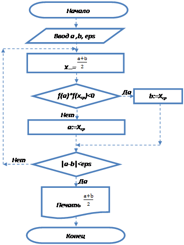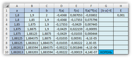 3. Метод уточнения корней Методы отделения корней весьма удобны и просты. Однако они дают ответ только на вопрос локализации корня и позволяют найти приближённое значение. Если же требуется найти более точное значение корня, то используют различные методы уточнении. 3.1 Метод половинного деления Для данного метода нужен отрезок [a;b] с корнем непрерывной функции f(x) внутри и точность определения корня, которая задаётся “e” Реализация метода в пакете Excel.