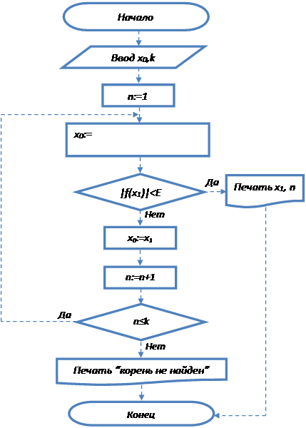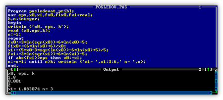 | Волжский государственный инженерно–педагогический университет Институт дизайна Курсовая работа Тема: “Компьютерное моделирование вычислительных задач в различных средах программного обеспечения” Выполнил: Чесноков Д.С. Проверил: Ершов В.Н. Нижний Новгород 2010г Содержание Введение 1. Постановка задачи 2. Метод отделения корней 2.1. Графический метод 2.2. Аналитический метод 3. Метод уточнения корней 3.1 Метод половинного деления 3.2 Метод последовательных приближений 3.3 Метод Ньютона 4. Анализ результатов Заключение Список используемой литературы Введение Существует значительное число различных программных продуктов (Mathcad, Excel и т.д.), с помощью которых можно решать различные математические задачи. MathCAD – программа для выполнения инженерных и научных расчётов. Рабочая область программы представляется как обыкновенный лист, на котором уравнения и выражения отображаются графически, а не в текстовом виде. Несмотря на то, что данная программа ориентирована на пользователей, мало знакомых с программированием, она всё же находит применение в достаточно сложных проектах для визуализации результатов математического моделирования с использованием распределённых вычислений и традиционных языков программирования. Также Mathcad часто используется в крупных инженерных проектах, где большое значение имеет трассируемость и соответствие стандартам. Excel - пожалуй, самая популярная сегодня программа электронных таблиц. Ею пользуются деловые люди и ученые, бухгалтеры и журналисты. С ее помощью ведут разнообразные списки, каталоги и таблицы, составляют финансовые и статистические отчеты, обсчитывают данные каких-нибудь опросов и состояние торгового предприятия, обрабатывают результаты научного эксперимента, ведут учет, готовят презентационные материалы. Для ведения домашней бухгалтерии Excel тоже вполне подходит. Pascal - высокоуровневый язык программирования общего назначения. Один из наиболее известных языков программирования, широко применяется в промышленном программировании, а также очень часто в обучении программированию в высшей школе, является базой для большого числа других языков. Был создан Никлаусом Виртом в 1968-69 годах. 1. Постановка задачи Нам дано уравнение Будем считать что наше уравнение 1. Отделение корней, т.е. нахождение достаточно малых промежутков, в которых содержится только один корень уравнения; Методы отделения корней весьма удобны и просты. Однако они дают только ответ на вопрос локализации корня и позволяют найти его грубое приближённое значение. В методы отделения корней входят графический метод, т.е построение графика функции y= f(x) и аналитический метод. 2. Уточнение каждого из отдельных корней, т.е определение их с заданной точностью. В нашем случае это точность E=0.001. Данные методы уточнения используется для нахождения более точного значения корня. Это такие методы как: Метод половинного деления, метод последовательных приближений и метод Ньютона. В данной курсовой работе все методы будут выполнены в специальных программах таких как: Excel, MathCAD и на языке программирования высокого уровня Pascal. 2. Метод отделения корней 2.1 Графический метод Графический метод основан на построении графика функции y=f(x). Он может быть реализован в два способа. Корнем уравнения будет отрезок оси абсцисс, содержащий точку пересеч