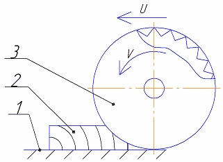 Рис. 2. Кинематическая схема станка ЦПА40 Гидравлическая схема привода подачи суппорта показана на рис. 3. Масло от насоса Н поступает к предохранительному клапану КП и распределителю Р, управляющему гидроцилиндром Ц. При нажатии на педаль электромагнит ЭМ переключает распределитель в левое крайнее положение и обе полости цилиндра соединяются с насосом одновременно. Вследствие разности создаваемых усилий от давления масла слева и справа поршень движется в сторону штоковой полости и суппорт совершает рабочий ход. В конце рабочего хода упор 5 со скошенным концом воздействует на рычаг 3 и переключает распределитель вправо. В момент переключения бесштоковая полость цилиндра соединяется с баком Б и суппорт совершает обратный ход. В конце хода ограничитель 1 нажимает на упор 6, который переключает рычаг 4 и распределитель в исходное правое положение. Суппорт останавливается. Для повторения цикла необходимо вновь нажать на педаль. Скорость рабочего хода регулируют дросселем ДР, ручка 2 которого расположена на распределителе. 1.7 Краткое описание конструкции станка Станок торцовочный модели ЦПА40 прост по устройству и надежен в эксплуатации при условии выполнения всех требований. На станине – полой чугунной отливке, являющейся одновременно масляным резервуаром, смонтирован опорный корпус суппорта. Корпус совместно с суппортом, при надобности, может подниматься и поворачиваться на определенную величину. Суппорт опирается на подшипниках качения и посредством гидропривода совершает возвратно-поступательные движения. В головной части суппорта крепится электродвигатель с режущим инструментом на валу. Управляется станок дистанционно посредством педали. 1.8 Требования к качеству обработанной поверхности, факторы, влияющие на качество обработки Влияние породы древесины. На обрабатываемость, т. е. на силовые и качественные показатели процесса резания, влияют структура и механические свойства, которые различны у древесины разных пород. Влияние влажности. При увеличении влажности до предела гигроскопичности снижаются показатели механической прочности древесины и ,следовательно, уменьшается сила резания. При открытом резании древесины, имеющей влажность выше предела гигроскопичности, свободная влага попадает на поверхности лезвия и действует как смазка. При этом уменьшается коэффициент трения и дополнительная сила резания. При закрытом резании, когда с древесиной активно взаимодействуют задние поверхности вспомогательных лезвий (боковые поверхности зубьев) и даже поверхности корпуса инструмента, влияние влажности древесины проявляется по-другому: при увеличении влажности повышаются упругие свойства древесины, усиливается «защемление» лезвия в пропиле, увеличивается сила резания. Влияние температуры. Прочность древесины, особенно влажной, при нагревании древесины уменьшается. Это вызывает уменьшение силы резания. Влияние толщины срезаемого слоя. Известно, что сила резания и ее составляющие – касательная и нормальная – складываются из сил, действующих со стороны отдельных элементов лезвия: режущей кромки, передней и задней поверхностей. Для расчетов процесса резания необходимы численные значения касательной и нормальной сил резания, удельной работы резания, а также параметров шероховатости для различных тол