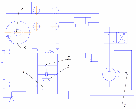 Рис. 1. Описание функциональной схемы станка: 1-стол; 2- заготовка; 3- пила. 1.6 Кинематическая схема (пневмо-, гидро схемы) и ее описание Кинематическая схема станка модели ЦПА40 представлена на рис. 2. На станине полой чугунной отливке смонтирован опорный корпус суппорта. Корпус совместно с суппортом может подниматься и поворачиваться на определенную величину. Суппорт опирается на подшипники качения и посредством гидропривода совершает возвратно-поступательные движения. В головной части суппорта крепится электродвигатель 2 с режущим инструментом 6 на валу. Управляется станок дистанционно, посредством педали. Длина хода суппорта устанавливается по шкале при помощи ограничителя рабочего хода, закрепленного в пазу хвостовой части суппорта. Установка суппорта на определенную высоту пропила производится подъемным механизмом 3, 4, 5 по шкале, закрепленной на станине. Регулировка скорости рабочего хода суппорта осуществляется лимбовым устройством, расположенным на корпусе золотника. По мере поворота лимба по часовой стрелке скорость движения суппорта уменьшается.
