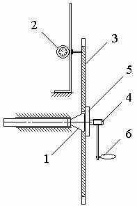Рис. 5. Приспособление для выявления дефектов полотна пилы Перед началом измерений индикатор 2 ориентируем относительно плоскости, проходящей через торцовую поверхность коренной шайбы 1. Для этого на поверхность коренной шайбы и ножку индикатора накладываем поверочную линейку. Нулевую отметку циферблата подводим к большой стрелке индикатора. При определении неплоскостности пилу 3 устанавливаем на вал 4, зажимаем шайбой 5 и медленно вращаем за рукоятку 6. Величина допустимого торцевого биения для нашего инструмента составляет до 0,19 мм. Превышение нормативных значений неплоскостности свидетельствует о наличии дефектов полотна, которые делят на общие (тарельчатость, крылонатость, изгиб по окружности) и местные (слабое место, тугое место, выпучина, изгиб). Все дефекты исправляем посредством правки полотна. Способ правки зависит от типа дефекта. Слабые места С исправляем ударами проковочного молотка с круглым бойком вокруг дефектного места, постепенно ослабляя удары по мере удаления от него. Удары наносим с обеих сторон пилы. Тугие места Т исправляем ударами проковочного молотка внутри зоны дефекта от границ к середине. Удары наносим с обеих сторон пилы. Выпучину В исправляем ударами проковочного молотка со стороны выпучины. Чтобы не изменить общего натяжения полотна, между пилой, положенной выпучиной вверх, и наковальней помещаем картонную или кожаную прокладку. Изгиб пилы И (складки у зубчатой кромки, отогнутые участки кромки, горбатость и одностороннюю крыловатость диска) исправляем ударами правильного молотка (с продолговатым бойком) либо по самому хребту изгиба, либо, если размеры дефекта значительны, от краев изгиба к хребту со стороны выпуклости. Ось бойка должна совпадать с направлением оси изгиба. Оценку напряженного состояния диска пилы производим по величине прогиба пилы под действием собственной массы. Пилу устанавливаем сначала одной стороной вверх, а затем другой в горизонтальное положение на три опоры, отстоящие на равном расстоянии друг от друга и на расстоянии 5 мм от окружности впадин зубьев. Прогиб пилы измеряем индикатором часового типа (или поверочной линейкой и набором щупов) в трех точках на окружности радиусом 50 мм и подсчитываем среднюю величину прогиба. Если эта величина не соответствует 0,2 мм по [3] табл. 20, диск пилы проковываем или вальцуем (только после правки). Вальцевать пилу будем по одной окружности радиусом 0,8R (где R - радиус пилы без зубьев) в течение трех-четырех оборотов пилы под действием роликов [6, с. 180-181]. Сила прижима роликов при вальцевании по одной окружности с радиусом 0,8R составляет 17 кН по [2] табл. 28 Правильно провальцованная пила должна приобретать равномерную вогнутость (тарельчатость). Величины вогнутости провальцованности нашей пилы, измеренные с обеих сторон на расстоянии 15 мм от края центрального отверстия пилы, должны соответствовать 0,2 мм. После вальцевания проверяем плоскостность и правим полотно пилы. Оборудование, приборы и инструменты для вальцевания нашей пилы: станок ПВ-20 с приставкой; прибор для контроля степени проковки и вальцованной пилы с часовым индикатором; поверочные линейки, набор щупов [6, с. 180]. Проковка пил не механизирована и требует высокой квалификации. Она заключается в нанесении ударов проковочным молотком по центральной части пилы, лежащей на на