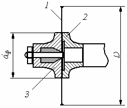 Рис. 6. Конструкция самоцентрирующихся фланцев 2. Ось вращения пилы должна совпадать с осью вала. Для этого применим фланец 3 с центрирующим конусом (рис. 6). 3. Для обеспечения надежного зажима пилы фланцы контактируют с пилой только наружными ободками шириной 20-25 мм. Для предотвращения самопроизвольного отворачивания гайки в процессе работы применим гайку с обратным направлением резьбы по отношению вращения вала. 4. Выход зубьев под распиливаемым материалом для нашего станка не должен превышать высоты зуба. 5. Устанавливать в станок неуравновешенные диски не допускается, так как это может вызвать сильное биение вала, потерю устойчивости пильным диском во время работы, неудовлетворительное качество распиливания, быстрый износ подшипников пильного вала. Неуравновешенность дисков вследствие неравномерной их толщины выявляют с помощью специального приспособления для статической балансировки. Устраняют неуравновешенность (дисбаланс) диска перешлифовкой поверхностей диска. Подготовка зубьев пил к работе. В подготовку зубьев пил к работе входят насечка зубьев, уширение зубчатого венца, заточка и фуговка зубьев. Насечка зубьев выполняем, когда необходимо изменить профиль зуба, если на пиле сломаны три (всего) или два зуба подряд. Для насечки применяем механически пилоштамп ПШП-2. В штампуемом контуре зубьев следует предусматривать припуск 1-1,5 мм относительно требуемого профиля. Окончательную форма зубьев достигаем заточкой их на пилоточных станках. При этом стачиваем слой металла с дефектами, образовавшимися при штамповке. Широко применяется нарезка зубьев и посадочных отверстий лазером, имеющая ряд преимуществ: отсутствуют изгибы полотна или диска, исключается образование неравномерного по толщине слоя наклепанного металла и необходимость односторонней правки полотен и дисков, геометрическая точность каждого и копирования всех зубьев повышается, не образуются микротрещины по контуру зубьев, увеличивается срок службы пил, снижается шум при изготовлении и работе пил. Уширение зубчатого венца. Развод зубьев - наиболее универсальный метод, применяемый для пил поперечного пиления с косой заточкой. Развод заключается в отгибании кончиков зубьев поочередно в правую и левую стороны на 1/3-1/2 высоты зуба от его вершины. Разводить зубья пил можно как до заточки, так и после нее. Оборудование, приспособления и инструменты для развода зубьев нашей пил: станок РАП8 (диаметр пил до 800 мм), ручные разводки ПИ-39, тиски для зажима пилы при разводе, индикаторный разводомер для контроля точности развода. Точность развода контролируем индикаторным разводомером. Допускаемые отклонения величины развода отдельных зубьев пилы - ±0,05 мм [6, с. 183-184]. Для заточки зубьев применим станок ТчПК8, со шлифовальными кругами ЭБ25СТ2Б5 и ЭБ40СТВ. Подача на один ход круга не должна превышать 0,06 мм. Подшлифовываем зубья точильным кругом ЭБ40СТВ. При этом делаем два-три легких прохода с величиной врезания на один ход круга не более 0,02 мм. Заусенцы с боковых граней снимаем мелкозернистым шлифовальным бруском. Прифуговку выполняем по высоте зубьев и по ширине режущей кромки (с боков) на заточных станках. Прифуговку на валу осуществляем мелкозернистым оселком (зернистость 5...10) при вращении пилы в направлении, обратном рабочему, и малой частоте вращения [5, с. 155]. 1.1