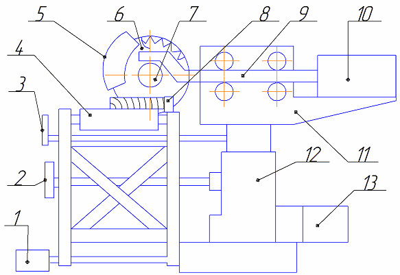 1 – педаль, 2 – маховичок подъема колонки, 3 – рукоятка зажима колонки, 4 – стол с роликами, 5 – ограждение, 6 – пила, 7 – электродвигатель, 8 – направляющая линейка, 9 – суппорт, 10 – гидроцилиндр, 11 – колонка, 12 – станина, 13 – электродвигатель гидропривода подачи