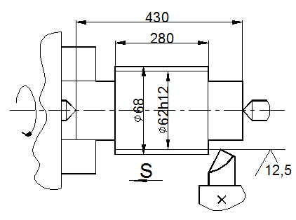 где L - путь инструмента в направлении рабочей подачи, мм; i - количество проходов. L=l+y+ где l - размер обрабатываемой поверхности в направлении подачи; y - величина врезания, мм; y=t×ctgj , где t - глубина резания; j - главный угол в плане резца. Пример решения задачи На токарно-винторезном станке 16К20 производится черновое обтачивание на проход вала D=68 мм до d=62h12 мм. Длина обрабатываемой поверхности 280 мм; длина вала l1 = 430 мм. Заготовка - поковка из стали 40Х с пределом прочности sв =700 МПа. Способ крепления заготовки - в центрах и поводковом патроне. Система СПИД недостаточно жесткая. Параметр шероховатости поверхности Ra=12,5 мкм. Необходимо: выбрать режущий инструмент, назначить режим резания; определить основное время. Решение 1. Выполнение эскиза обработки.
