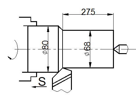 3.2 Назначаем подачу. Для державки резца сечением 25х25 мм, диаметра обработки до 100 мм и глубины резания до 8 мм рекомендуется подача S=0,5...0,7 мм/об; Проверим допустимость рекомендуемой подачи по мощности электродвигателя , прочности державки резца и прочности пластинки твердого сплава. Для глубины резания t=6 мм, мощности электродвигателя Nд =8 кВт и для резца j1 >0° допускается подача S=0,7мм/об. Для стали с пределом прочности sв =550 МПа (55 кг/мм2 ) поправочный коэффициент Км s =1,07. Следовательно, подача, допускаемая мощностью электродвигателя (из условий обеспечения работы для твердого сплава со скоростью не ниже 50 м/мин) S=0,7×1,07=0,75 мм/об. Для резца с державкой сечением 25х25 мм и глубиной резания t=6 мм находим подачу S=3 мм/об. Умножив эту подачу на поправочный коэффициент Км s =1,07, соответствующий стали с пределом прочности sв =550 МПа (55 кг/мм2 ), и Км s =0,58, соответствующий вылету резца l=1,5 H, найдем подачу, допустимую прочностью державки резца: S=3×1,07×0,58=1,86 мм/об. Для резца с главным углом в плане j=45°, толщиной пластинки твердого сплава с=4 мм и для глубины резания t=6 мм находим подачу S=1,11 мм/об. С учетом поправочного коэффициента для стали (sв =550 МПа), Км s =1,07, допускается подача по прочности пластинки твердого сплава S=1,11×1,07=1,19 мм/об. Из сопоставления подач S=0,7 мм/об, S=1,86 мм/об и S=1,19 мм/об, видим, что величину подачи лимитирует мощность электродвигателя. Подача, допустимая мощностью электродвигателя, не ограничивает максимальную подачу S=0,7 мм/об. Такая подача имеется на станке (согласно паспортным данным), следовательно, ее и примем для выполнения технологического перехода обработки Æ68 . 3.3. Скорость резания и частота вращения шпинделя. Для глубины резания t=6 мм резца проходного прямого с главным углом в плане j=45° для S=0,7 мм/об соответствует V=100 м/мин, Pz =6630 H, Nэ =10,7 кВт. Определяем поправочные коэффициенты для измененных условий резца. В данном примере необходимо учесть только поправочный коэффициент в зависимости от предела прочности обработанного материала sв