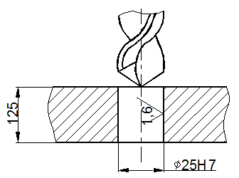 При рассверливании отверстий подача, рекомендуемая для сверления, может быть увеличена в 2 раза. Порядок назначения остальных элементов режима резания аналогичен назначению режимов резания при токарной обработке. Средние значения припусков на диаметр, снимаемых зенкерами и развертками см. в приложении 4. Пример решения задачи На вертикально-сверлильном станке 2Н125 обработать сквозное отверстие диаметром 25Н7 (Ra=1,6 мкм), l=125 мм. Материал заготовки СЧ18, НВ210. Необходимо: выбрать режущий инструмент, назначить режим резания по таблицам нормативов, определить основное время. Решение: