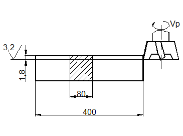 Эскиз обработки Рис.5 1. Выбор шлифовального круга. Для круглого наружного шлифования с продольной подачей (шлифовать с радиальной подачей нельзя из-за большой длины шлифуемой поверхности), параметра шероховатости Ra=0,4 мкм, конструкционной закаленной стали до HRC45 принимаем шлифовальный круг формы ПП, [2], характеристика – 24 А401К, [6], индекс зернистости – Н, [2], структура – 5, [6], класс – А, [2], Полная маркировка круга ПП24 А40НС15КА 35 м/с. Размеры шлифовального круга Dk =600 мм; Вк =63 мм (по паспорту станка). 2. Режим резания 2.1 Скорость шлифовального круга Vk =35 м/с [2]. Частота вращения шпинделя шлифовальной бабки