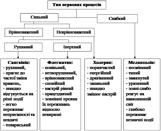 Будуючи наділеною від народження певними біологічними якостями, людина стає особистістю по мірі засвоєння соціального досвіду у своїх його проявах (способів і засобів виробництва, духовної культури тощо). Процес формування особистості і його значення для суспільного життя (виноситься на самостійну поза аудиторну роботу). Класифікація типів особистостей (Московський інститут соціальних досліджень): 1. Мислительно-інтуїтивний тип 2. Інтуїтивно-мислительний тип. 3. Емоційно-інтуїтивний тип. 4. Інтуїтивно-емоційний тип. 5. Мислительно-розсудливий тип. 6. Розсудливо-мислительский тип. 7. Емоційно-розсудливий тип. 8. Розсудливо-емоційний тип. (див. Вітенко І.С. Вітенко Т.І. „Основи психології”, с. 77-78). 2. В якості загальної основи особистісних властивостей витупає темперамент. Темперамент (від лат. „темперо” – зміщую в належному співвідношенні) – сукупність найбільш стійких індивідуально-психічних особливостей людини, які виявляються в динаміці її поведінки та діяльності. Термін „темперамент” запропонований давньогрецьким лікарем Гіппократом (460-377 рр. до н.е.) в 5 ст. до н.е. Він описав основні тими темпераменту, дав їм характеристику, проте віз зв’язував темперамент не з властивостями нервової системи, а з співвідношенням різних „соків” в організмі – крові, слизі і жовчі. - переважає кров („сангіус”) – сангвінік; - переважає слизь („флегма”) – флегматик; - переважає жовч („холе”) – холерик; - переважає чорна жовч („мелан холе”) – меланхолік. „Те, що змітає на своєму шляху холерик, обминає сангвінік, не бачить флегматик, стає великою бідою для меланхоліка” Гіппократ Вивчення фізіологічних основ темпераменту, яке було розпочато у ХХ ст. І.П. Павловим, дало можливість встановити: в основі темпераменту лежать властивості нервової системи: Співвідношення сили нервової системи (сила збудження і гальмування), її рухливості (зміни швидкості процесів збудження і гальмування), і рівноваги процесів збудження і гальмування. Саме це співвідношення властивостей нервової системи створює 4 основні типи темпераменту: 1) сильний неврівноважений тип – холерик; 2) сильний врівноважений рухливий – сангвінік; 3) сильний врівноважений інертний – флегматик; 4) слабкий тип – меланхолік.