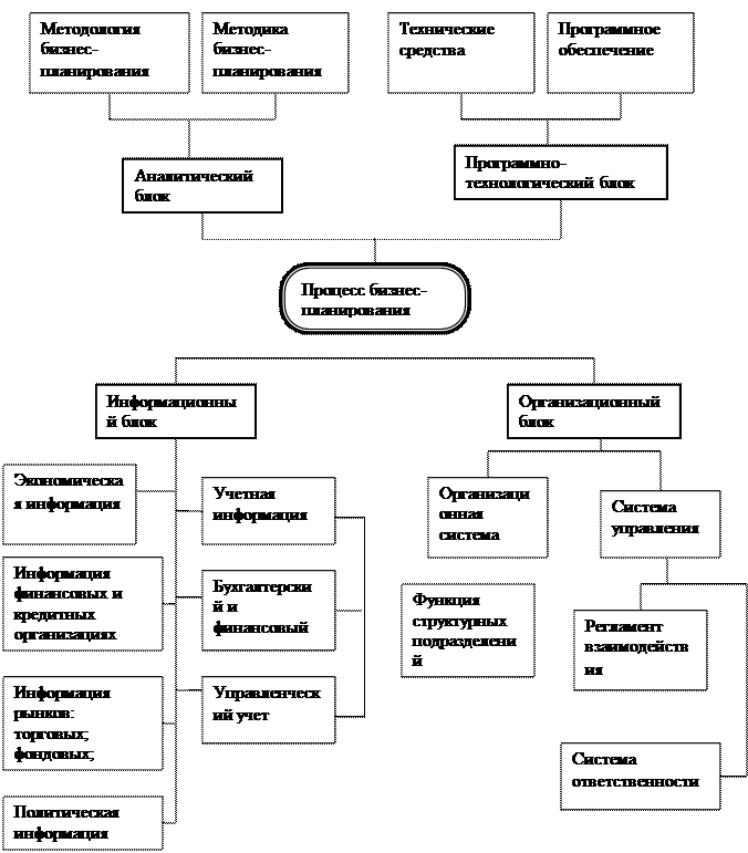 Табл. 2. Инфраструктура бизнес-планирования в коммерческой организации. Для успешной организации бизнес-планирования в коммерческой организации необходимо наличие четырех обязательных условий (компонентов), которые тесно связаны между собой и составляют инфраструктуру процесса бизнес-планирования коммерческой организации (табл. 2). Во-первых, коммерческая организация должна располагать соответствующей методологией и методикой базовой разработки, контроля и анализа исполнения бизнес-плана, а работники финансово-экономических служб должны быть достаточно квалифицированны, чтобы уметь применять эту методологию на практике. Методологическая и методическая база составления, контроля и исполнения бизнес-плана образует аналитический блок (или компонент) процесса финансового планирования. Во-вторых, для того чтобы разрабатывать финансовые планы, нужна внутренняя информация о деятельности предприятия и внешняя информация. Основой информационного блока процесса бизнес-планирования является: - экономическая информация – прогноз процентных ставок, прогноз темпов инфляции и т.д.; - учетная информация – информация бухгалтерского учета и управленческого учета; - сообщения финансовых органов, информация товарных, бюджетных бирж и прочая финансовая информация; - политическая информация и т.д. Кроме того, функционирование системы бизнес-планирования осуществляется в рамках действующего нормативно-правового обеспечения, к которому относятся: законы, указы Президента РФ, послания Правительства РФ, приказы и распоряжения отраслевых министерств, уставные документы, инструкции и др. В-третьих, процесс бизнес-планирования всегда реализуется через соответствующие организационную структуру и систему управления, составляющие организационный блок процесса. Понятие организационной структуры включает в себя: количество и функции служб аппарата управления, в чьи обязанности входят разработка, контроль и анализ бизнес-плана коммерческой организации; совокупность структурных подразделений, которые ответственны за исполнение бизнес-плана. В-четвертых, в процессе финансового планирования и контроля происходит регистрация и обработка больших массивов информации. Программно-технические средства, используемые в процессе финансового планирования и контроля, составляют программно-технический блок системы финансового планирования. Бизнес-планирование — это упорядоченная совокупность стадий и действий, связанных с ситуационным анализом окружающей среды, постановкой целей бизнес-планирования, осуществлением планирования (разработкой бизнес-плана), продвижением бизнес-плана на рынок интеллектуальной собственности, реализацией бизнес-плана, контролем за его выполнением. Можно выделить следующие основные стадии процесса бизнес-планирования: 1) подготовительная стадия; 2) стадия разработки бизнес-плана; 3) стадия продвижения бизнес-плана на рынок интеллектуальной собственности; 4) стадия реализации бизнес-плана. Ключевым моментом подготовительной стадии бизнес-планирования является формирование перспективной бизнес-идеи. Бизнес-идея – это идея нового продукта или услуги, технического, организационного или экономического решения и др. Источниками новых идей могут быть; — отзыв потребителей; — продукция, выпускаемая ко