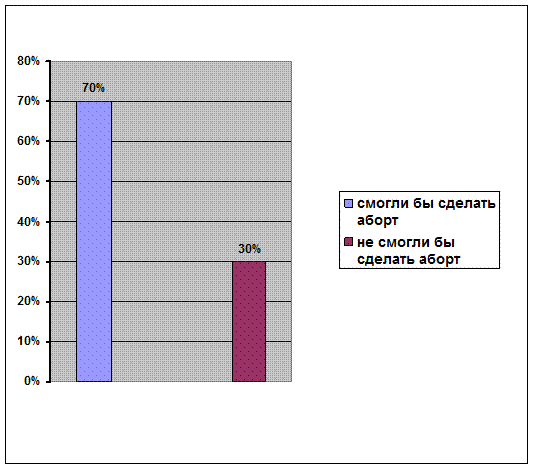 2. Отношение к аборту. В отношении аборта нами были получены следующие результаты. 21 девушка из опрошенных (70%) не смогла бы сделать аборт, остальные 9 (30%) признались, что пошли бы на это (рис. №2). Отношение к аборту является одной из самых ярких характеристик психологической готовности к материнству. С. Ю. Мещерякова выделяла переживание женщиной отношения к еще не родившемуся ребенку на этапе беременности в отдельную группу показателей готовности к материнству. Кроме того низкий уровень психологической готовности к материнству, также выделенный и описанный С. Ю. Мещеряковой, характеризуется колебаниями женщины в принятии решения иметь ребенка. Таким образом, можно сделать вывод о том, что если девушка готова пойти на аборт, то это характеризует уровень ее психологической готовности к материнству как низкий. Также можно сделать предположение о том, что не все из девушек были способны честно признаться в том, что смогли бы сделать аборт. Поэтому есть вероятность того, что процент респонденток, готовых пойти на аборт, на самом деле выше.