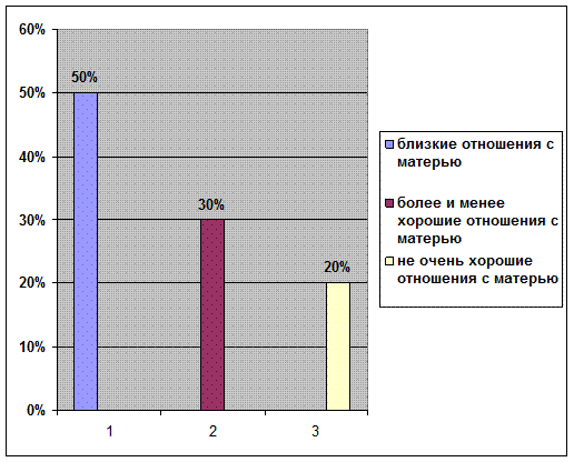 3. Отношения с матерью. При анализе данных беседы, касающихся отношений респонденток со своими матерями были получены следующие результаты. Для 15 девушек (50%) мама является самым близким человеком, у 9 девушек (30%) отношения с матерью более и менее хорошие, и 6 девушек (20%) расценивают взаимоотношения с матерью как не очень хорошие (рис. №3) Особенности коммуникативного опыта женщины в ее раннем детстве также выделены С. Ю. Мещеряковой в отдельную группу показателей психологической готовности к материнству. Исходя из концепции М.И. Лисиной, основы личности, отношение человека к миру и к себе самому закладываются с первых дней жизни в общении с близкими взрослыми. [21] Складывающееся в общении первое личностное образование может рассматриваться и как первый вклад в становление будущего родительского поведения. Если опыт общения с близкими взрослыми был положительным, это означает, что стартовые условия для формирования субъектного отношения к другим людям были благоприятными и основа для формирования субъектного отношения к своему ребенку заложена. Другими словами, близкие, доверительные отношения с собственной матерью кореллируют с высоким уровнем психологической готовности к материнству. Рис. 3. Отношения с матерью.