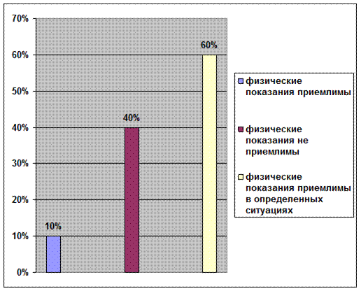 7. Настрой в отношении воспитания и ухода за ребенком. На вопрос о грудном вскармливании 9 девушек (30%) ответили, что вообще не собираются кормить грудью, обосновывая это тем, что из-за этого грудь перестает быть красивой, и кроме того в наличии есть очень много качественных смесей, которые вполне могут без вреда для здоровья ребенка заменить материнское молоко. Это говорит о предпочтении своих интересов потребностям ребенка. 15 девушек (50%) сказали, что готовы кормить ребенка до полгода. И только лишь 6 девушек (20%) сказали, что готовы кормить ребенка грудью столько, сколько это будет необходимо. Данные результаты отражены на рисунке №13. На вопрос о приемлемости физического насилия в воспитании ребенка, 10% ответили, что физические наказания приемлемы, 40% - что не приемлемы, 60% - что приемлемы только в определенных ситуациях. данные результаты также свидетельствуют о низкой готовности к материнству среди испытуемых. Данные результаты отражены на рисунке №14.
