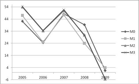 Таким чином, з даних табл. 2.2 можемо спостерігати, що зростання грошової маси в Україні відбувалося доволі нерівномірними темпами. Зокрема, найбільший приріст грошової маси спостерігався у 2005 та 2007 рр., низький – у 2006 р., а найнижчий – у 2009 р. Зокрема, протягом 2009 р. спостерігався від’ємний приріст грошових агрегатів М2 – - 5,42 % та М3 – - 5,51 %. Наочне відображення коливань ланцюгових темпів приросту грошових агрегатів показано на рис. 2.1. Як видно з рис. 2.1. відбувається помітне відхилення темпів приросту агрегату М0 від траєкторії агрегату М3 у 2008 р. – майже на 10 %, що свідчить про відчутне зростання грошей, які знаходяться поза банками. Практично синхронна зміна темпів приросту спостерігається у грошових агрегатів М1, М2 та М3. При цьому темпи приросту грошових агрегатів М2 та М3 практично ідентичні. Загальні зміни грошової маси у середньому складають 38,4 %, а в 2008 р. її приріст становив приблизно 30%. Однак в 2009 р. відбувається значне падіння темпів приросту усіх грошових агрегатів, тобто грошової маси України взагалі. Проте при цьому можемо спостерігати відхилення траєкторії агрегату М1 в позитивну сторону від траєкторії зміни грошової маси.