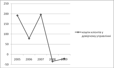 При цьому, 2008 р. характеризується високими темпами приросту готівки, та від’ємним приростом коштів на розрахункових і поточних рахунках у банках. Тобто відбувся значний відтік коштів із банківського сектору економіки. Однак, вже в 2009 р. можемо спостерігати протилежну тенденцію – темп приросту готівкових грошей знизився в 28 раз, а приріст коштів на розрахункових і поточних рахунках в банках становив більше 9%. Найбільший же середньорічний темп приросту характерний для коштів клієнтів, які знаходяться у довірчому управлінні – 82,1 %. Хоча при цьому амплітуда коливань річних темпів приросту є доволі великою (рис. 2.2). Упродовж усього досліджуваного періоду спостерігається широкий розмах варіації ланцюгових показників, що вказує швидше на спонтанні, некеровані, ніж на цілеспрямовані, усвідомлені зміни у грошовому вираженні компонента «кошти клієнтів у довірчому управлінні». Характер цих змін може сприйматися як цілком логічний наслідок недосконалості ринку цінних паперів. Таким чином, незважаючи на те, що характер зміни інтенсивності темпів річного приросту готівки визначаються Національним банком, закономірних зв’язків між річними змінами компонентів грошових агрегатів не спостерігається.