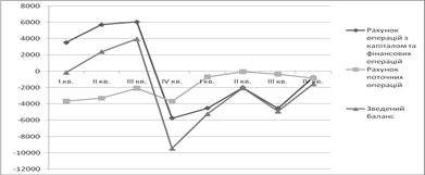 Детальний аналіз грошової пропозиції в Україні, дослідження змін її структурних складових довели, що гроші в 2004 – 2005 рр. принципово відрізняються від грошей у 2008 – 2009 рр. Через різні ролі та призначення агрегати надають різні імпульси та забезпечують різну ефективність грошово-кредитної політики. Емітовані готівкові кошти не перемістилися в реальний сектор економіки, а поступово перетворилися на строкові кошти в національній валюті та валютні кошти. Продемонстроване зменшення частки коштів клієнтів у довірчому управлінні вказує на скорочення економічної активності в реальному секторі економіки. У загальному випадку це виглядає як процес перетікання більшості грошової маси у заощадження, механізми прямування яких у реальний сектор економіки наразі відсутні, зокрема ринок цінних паперів так і не розгорнуто. Таким чином, можна стверджувати, що монетарний важіль управління економікою в Україні не задіяний. Для розуміння специфіки грошово-кредитного регулювання в Україні проведемо аналіз платіжного балансу країни за 2008 – 2009 рр. (додаток А). У 2009 р. зниження зовнішнього попиту та світових цін внаслідок глобальної кризи обумовили суттєве зменшення надходжень від експорту товарів і послуг – на 36,7%. Але відсутність зовнішнього фінансування, скорочення внутрішнього попиту та девальвація обмінного курсу гривні наприкінці 2008 р. визначили ще більше падіння імпорту – на 43,1 %. Як наслідок, в цілому за 2009 р. дефіцит поточного рахунку суттєво скоротився – до 1.9 млрд. дол. США (близько 1.7 % від ВВП) порівняно з 12.8 млрд. дол. США в 2008 р. (7.0 % від ВВП) (рис. 2.3). У той же час сальдо фінансового рахунку платіжного балансу сформувалось від’ємним (11.8 млрд. дол. США), що було обумовлено насамперед чистим погашенням накопиченої у попередні роки зовнішньої заборгованості приватним і державним секторами економіки (9,0 млрд. дол. США). У грудні ситуація з платіжним балансом стала нагадувати події попередніх років, коли зростаючий дефіцит поточного рахунку фінансувався приторком капіталу, насамперед позикового. Так, уперше в 2009 р. фінансовий рахунок було сформовано з профіцитом (363 млн. дол. США) через додатне сальдо за статтею «Кредити та облігації» (676 млн. дол. США).