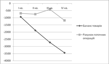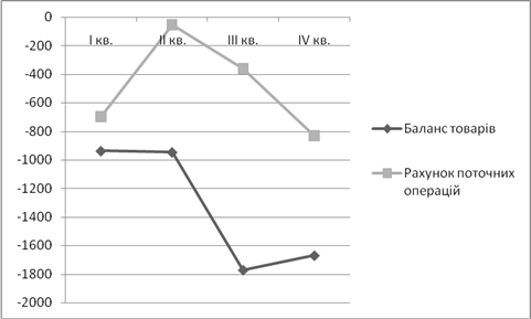 Рис. 2.4. Динаміка балансу товарів та рахунку поточних операцій протягом 2009 р. Окрім стандартної сезонності основними чинниками такого розширення дефіциту товарного балансу наприкінці року стало відновлення внутрішнього попиту та стабілізації на валютному ринку. Також суттєвий вплив на розширення дефіциту поточного рахунку мало й традиційне для кінця року скорочення додатного сальдо торгівлі послугами.