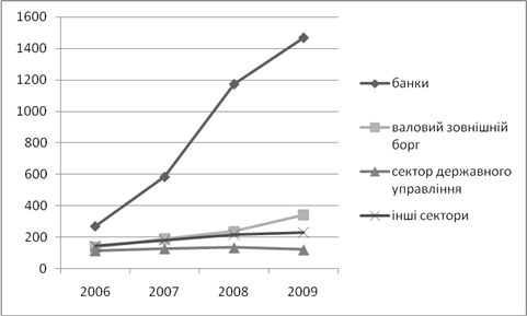 Рис. 2.6. Динаміка зовнішнього боргу України за 2005 – 2009 рр., % до 01. 01. 2005 р [32, с. 54]. Якщо станом на початок 2005 р. на сферу відповідальності уряду припадало більше третини зовнішнього боргу – 36,6%, то на дату календарного відліку світової фінансової кризи (початок жовтня 2008 р.) ця частка скоротилася майже втричі – до 11,76 % (табл. 2.7). Натомість зовнішня заборгованість банків із 8,7% зросла до 32,16 %. Разом із заборгованістю корпоративного бізнесу вона сягнула 72 % загального зовнішнього боргу України та перевищила 75 млрд. дол., що у 2 рази більше від офіційних валютних резервів України, які перебувають в оперативному управлінні НБУ. Таблиця 2.7 Структура зовнішнього боргу України протягом 2006 – 2009 рр.