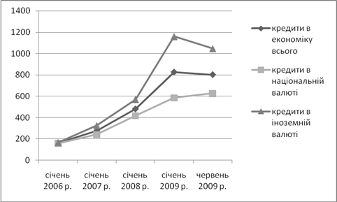 Рис. 2.8. Динаміка кредитних вкладень банків України за 2005 – 2009 рр. в розрізі валют, % до 01.01.2005 р [38, с. 440] Як бачимо з рис. 2.8, протягом досліджуваного періоду в Україні чітко простежується тенденція випереджаючого зростання обсягів кредитування в іноземній валюті (в основному в доларах США). Активізація процесу доларизації хронологічно збігається з нарощуванням присутності іноземних банків на вітчизняному ринку. Причому якщо станом на початок 2005 р. на іноземну валюту припадало 42 % загального обсягу виданих в Україні кредитів, то вже на початку 2007 р. обсяги кредитів у іноземній валюті зрівнялися з гривневими, а станом на 1 жовтня 2008 р. кредити в іноземній валюті перевищили гривневі – 51,4 %. Переоцінка цієї заборгованості внаслідок обвалу курсу гривні призвела до того, що на початку 2009 р. частка інвалютних кредитів становила 57,7 % від загальної суми заборгованості клієнтів банкам. Водночас потрібно наголосити, що значні масштаби доларизації економіки України несуть у собі серйозні загрози для національної грошової системи не так через ризики, яких сьогодні зазнає обіг долара як провідної світової валюти, як через обмеження можливостей повноцінного монетарного регулювання економіки, що виникають за умов паралельного перебування в обігу нарівні з національною грошовою одиницею іноземної валюти. Тому доларизація економіки України як результат фінансової глобалізації є явищем більшою мірою негативним, хоча й цілком об’єктивним. Таким чином, підсумовуючи проведений аналіз стану грошового обороту України та його регулювання можемо зазначити, що на сьогоднішній день вичерпалися всі наявні в Україні важелі регулятивного впливу на грошовий ринок, а тому постає нагальна потреба в розробці нових методів та запровадженні нових підходів грошово-кредитного регулювання, застосуванні інших монетарних стратегій. РОЗДІЛ 2. НАПРЯМКИ УДОСКОНАЛЕННЯ ДЕРЖАВНОГО РЕГУЛЮВАННЯ ГРОШОВОГО ОБОРОТУ УКРАЇНИ Фінансова криза, що відбувається у світі, зумовила погіршення стану економік майже всіх країн. Відбувається зупинення підприємств, падіння обсягів виробництва, зменшення реальних доходів населення, погіршується стан банківської системи. Порівняно з багатьма іншими країнами вплив глобальної кризи на Україну виявився досить суттєвим, що пояснюється особливостями інтеграції країни в систему світо господарських зв’язків та структури національної економіки, незавершеністю багатьох інституційних та структурних реформ. До того ж економічна криза в країні розгортається на тлі політичної кризи, що об’єктивно ускладнює процес вироблення та реалізації антикризової політики. Криза, яка з особливою гостротою розгорнулася восени 2008 р., виявила усю безпорадність самостійного і неузгодженого управління грошово-кредитною політикою з боку Національного банку України. Таким чином, назріла нагальна потреба в розробці системи заходів впливу на певні грошові індикатори. Аналізуючи досвід подолання фінансової кризи в зарубіжних країнах, можна назвати два основних шляхи державного регулювання: 1. США, ЄС та Японія обрали шлях зниження центральними банками облікової ставки та норм резервування для комерційних банків. 2. Росія, зіштовхнувшись із проблемою великомасштабного відтоку капіталу та необхідністю витрачати великі кошти на обслуговування 