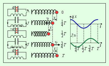 Превращение потенциальной энергии пружины в кинетическую энергию колеблющегося тела является механической аналогией превращения энергии электрического поля конденсатора в энергию магнитного поля катушки. При этом аналогом механической потенциальной энергии пружины является энергия электрического поля конденсатора, а аналогом механической кинетической энергии груза является энергия магнитного поля, которая связана с движением зарядов. Зарядке конденсатора от батареи соответствует сообщение пружине потенциальной энергии (например, смещение рукой). Давайте сопоставим формулы и выведем общие закономерности для электромагнитных и механических колебаний. Из сопоставления формул следует, что аналогом индуктивности L является масса m, а аналогом смещения х служит заряд q, аналогом коэффициента k служит величина, обратная электроемкости, т. е. 1/С. Моменту, кода конденсатор разрядится, а сила тока достигнет максимума, соответствует прохождение телом положения равновесия с максимальной скоростью (обратите внимание на экраны: там вы можете пронаблюдать это соответствие).