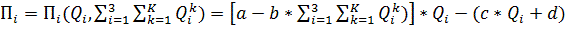 Таким образом, сформулирована модель поведения операторов на рынке, позволяющая судить о том, каким образом размер трафика влияет на суммарную прибыль операторов. В модели учтены различные виды услуг связи, которые участвуют в формировании рыночной цены на единицу услуг (минуты). Применительно к олигополистическому рынку мобильной телефонии эти варианты поведения игроков формулируются следующим образом: I. Равновесие Курно. Каждый из олигополистов считает, что изменение объёма трафика услуг связи не повлияет на объём трафика услуг связи других участников рынка. II. Равновесие Стэкельберга. Один или несколько игроков олигополистического рынка действуют согласно модели Курно, тогда как остальные предполагают, что конкурент (конкуренты) выберут первую стратегию. III. Неравновесие Стэкельберга. Олигополисты не действуют в рамках модели Курно, т.е. все операторы ведут себя согласно равновесию Стэкельберга и неправильно предполагают, что другой (другие) выберут политику поведения первого типа. IV.Кооперативная олигополия. Все игроки олигополистического рынка мобильной связи могут вступить в соглашение о совместной деятельности с целью получения максимальной совокупной прибыли так называемого простого товарищества[6] . Равновесие Курно. Найдём средний объём трафика i -го оператора Qi (i = 1, …, n , где n – общее количество игроков на рынке), суммарный объём трафика Q и прибыль от продаж П i i -го оператора: