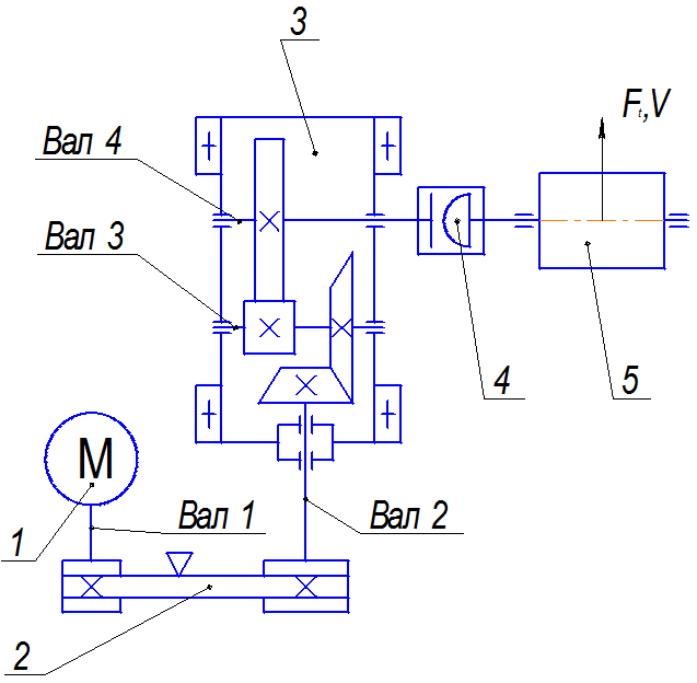 1 – электродвигатель; 2 – ременная передача; 3 – двухступенчатый коническо-целендрический редуктор; 4 – компенсирующая муфта; 5 – узел барабана. Рисунок 1 – Кинематическая схема привода ленточного конвейера