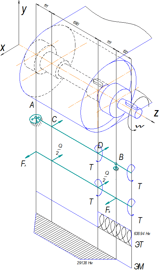 Из расчетной схемы (Рисунок 8) видно, что опасным сечением является сечение D, так как в этом сечении одновременно приложены максимальные крутящий и изгибающие моменты. ТD = 638,94 Нм МD = 0,111. 862,5 = 291,38 Нм Тогда: