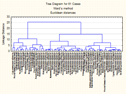 Табл 1.1 Парные коэффициенты корреляции. Как видно из таблицы (Табл. 1.1), между данными нет слишком сильных взаимосвязей, следовательно, построенные кластерные модели будут адекватно отображать действительность. Так как наши показатели имеют разные меры измерения, то для дальнейшего кластерного анализа нам требуется простандартизировать исходные данные. Таблица стандартизированных данных представлена в Приложении 3. 2.1 Евклидова Метрика Теперь, когда наши данные готовы к использованию, можно провести кластерный анализ. Для этого используем методы ближнего и дальнего соседа, а также методы Варда и k-средних. В кластерном анализе, как известно более распространены иерархические процедуры. Расстояние между исследуемыми объектами будет определяться по обычному невзвешенному Евклидову расстоянию. После проведенного кластерного анализа было получено три дендрограммы. Наиболее точное разбиение на кластеры дает метод Варда, которая приведена ниже на рис. 2.1.1. Рис 2.1.1