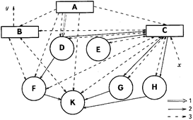 Рис. 2. Потоки непревратимой и сильные потоки превратимой энергии между основными блоками экосистемы: 1 - превратимая энергия фотосинтетически активной радиации (ФАР); 2 - превратимая энергия химических связей; 3 - потоки тепла (непревратимой энергии); х - поток внутреннего тепла Земли, у - тепловое излучение в космос. Блоки: А - радиация Солнца, В - атмосфера; С - почвогрунт, D - фотоавтотрофные организмы; Е - хемоавтотрофные организмы; F - хемогетеротрофы-биофаги первого порядка; G - хемогетеротрофы-сапрофаги; Н - прототрофы-сапрофаги; К - хемогетеротрофы-биофаги высших порядков.